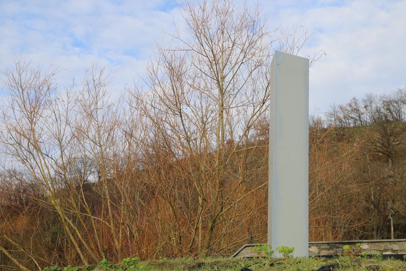 Located in a garden, in Hamoir, Belgium stands this Monolith. It's painted, and etched with 'Made in Atlantis' in small lettering on one side.