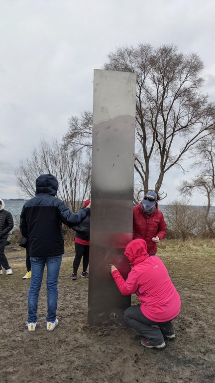 3 m tall, very clean surface. metallic looking Monolith. Appeared at Humber Bay Shores, in Toronto.